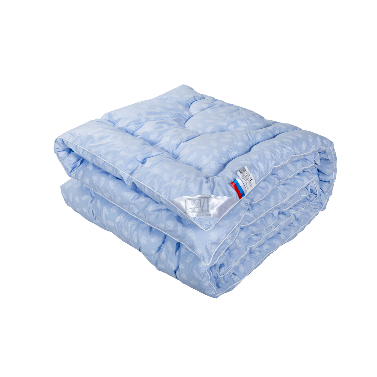 Одноигольная машинаодеяло с наполнителем - "Лебяжий пух" (сверхтонкое полое извитое высокосиликонизированное микроволокно)-400 г/кв.м, чехол (хлопок 100%)- ткань тик (голубой с перьями) , кант, уголок, бирка, флажок, постер, в чемодане